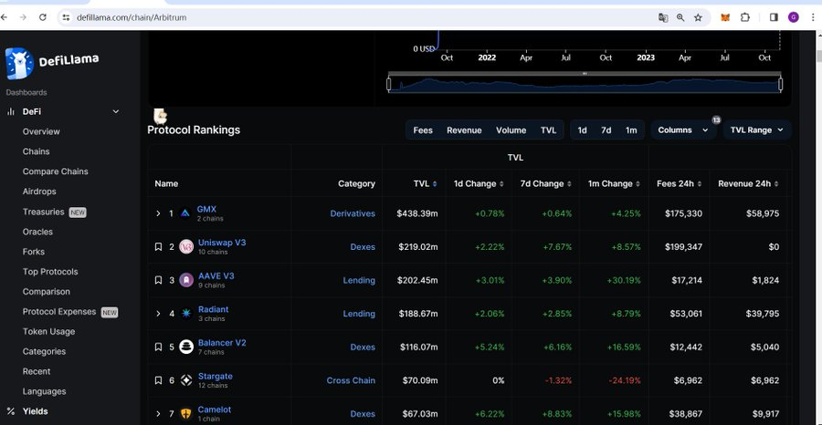 以Arbtrum为例, 点击Arbtrum即可进入到相应的页面,这个页面全是部署在Arbtrum链上的Dex、NFT、Staking、Lending项目。