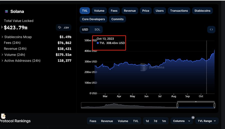 图中数据显示,Solana的TVL从10.13日开始上涨,但起代币价格从10.20日才开始上涨,期间有个很明显的时间差。
