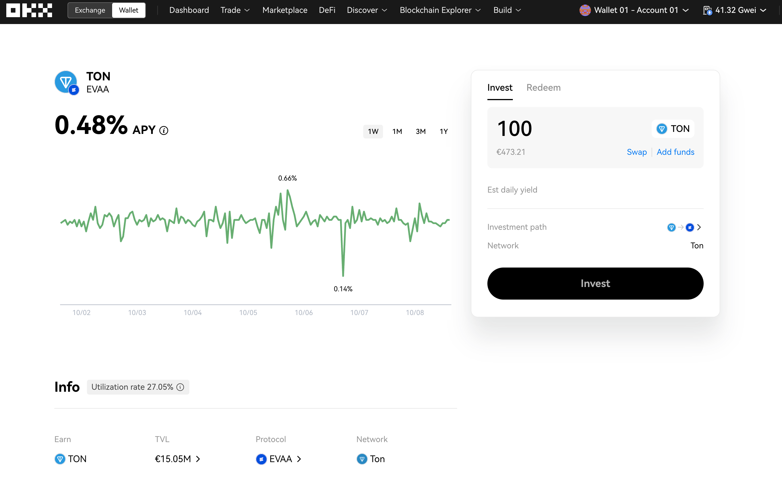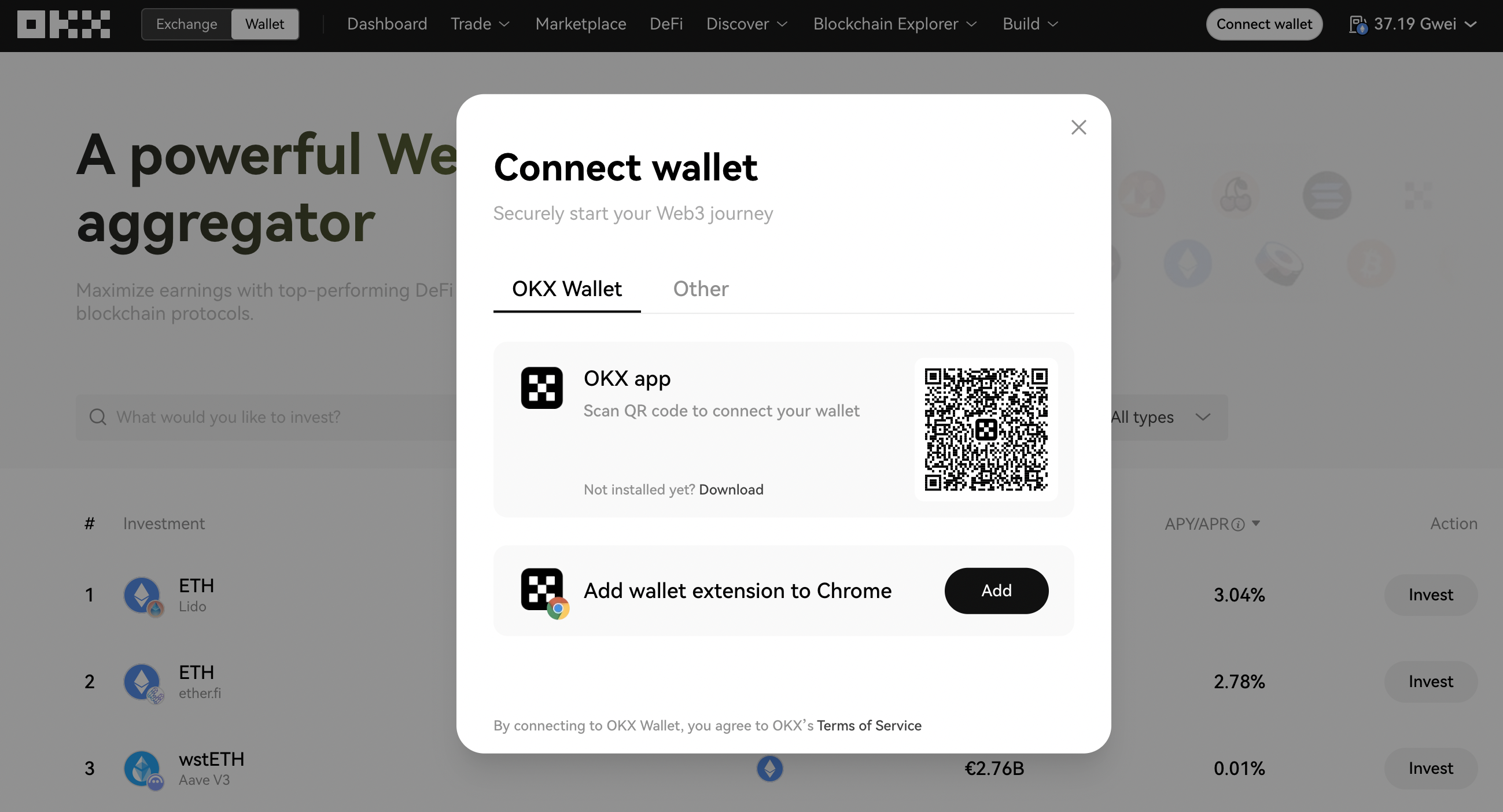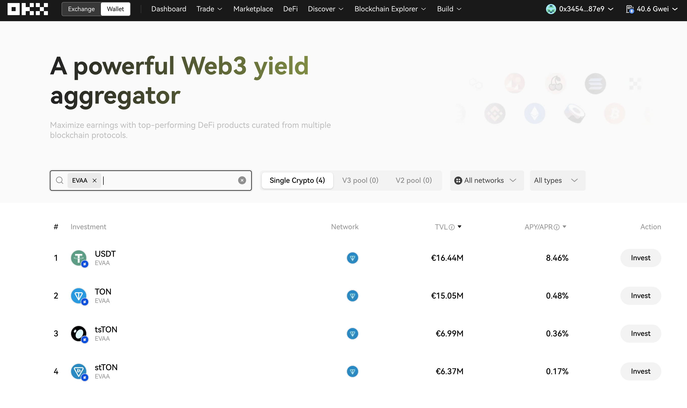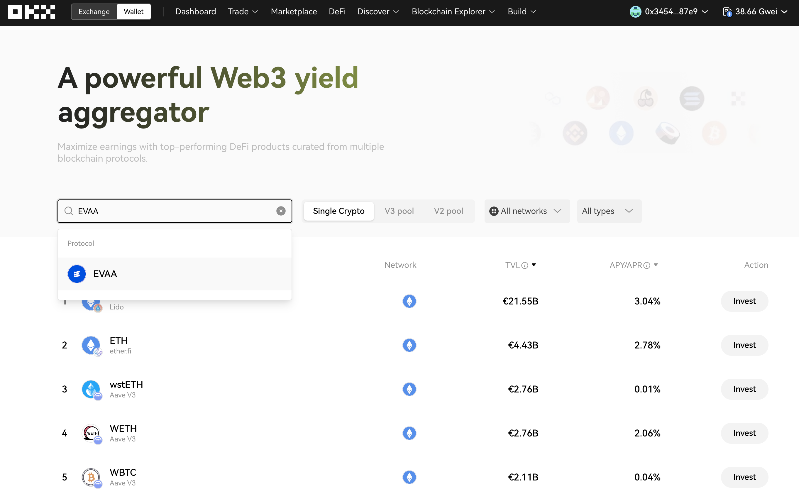 Once your OKX wallet is ready, you can explore earning opportunities with EVAA through OKX's DeFi Aggregator.