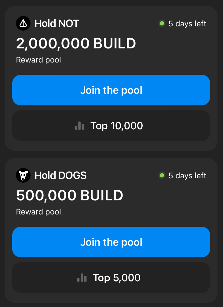The $BUILD farming pool offers large rewards for users who participate using DOGS, NOT, and TON. Here’s the allocation breakdown:
