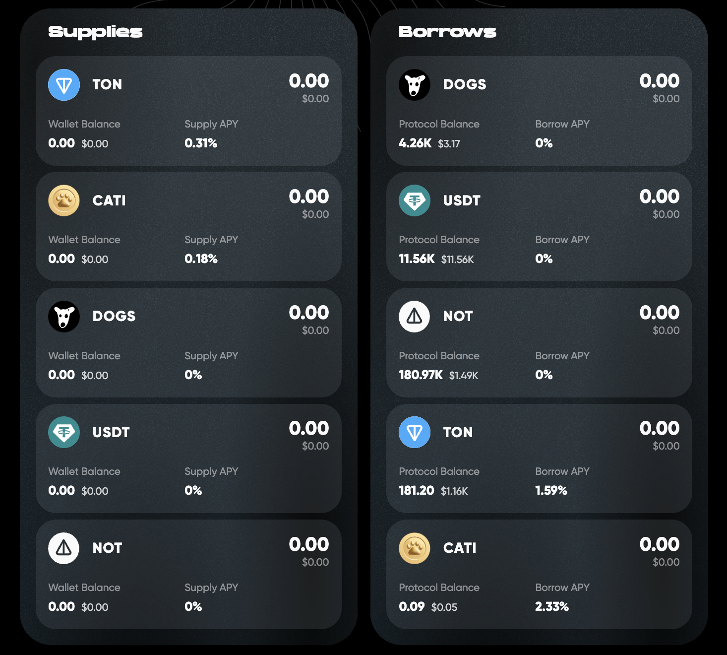 Supply: Deposit DOGS, NOT, CATI, TON, or USDT into the pool to earn APY. Your tokens work for you, generating passive income while supporting liquidity for other users.