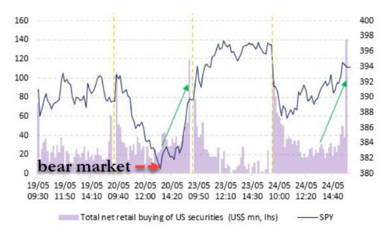 According to Vanda’s analysis, net retail buying since May 20 has shown a high correlation with intraday price movements in the S&P 500.