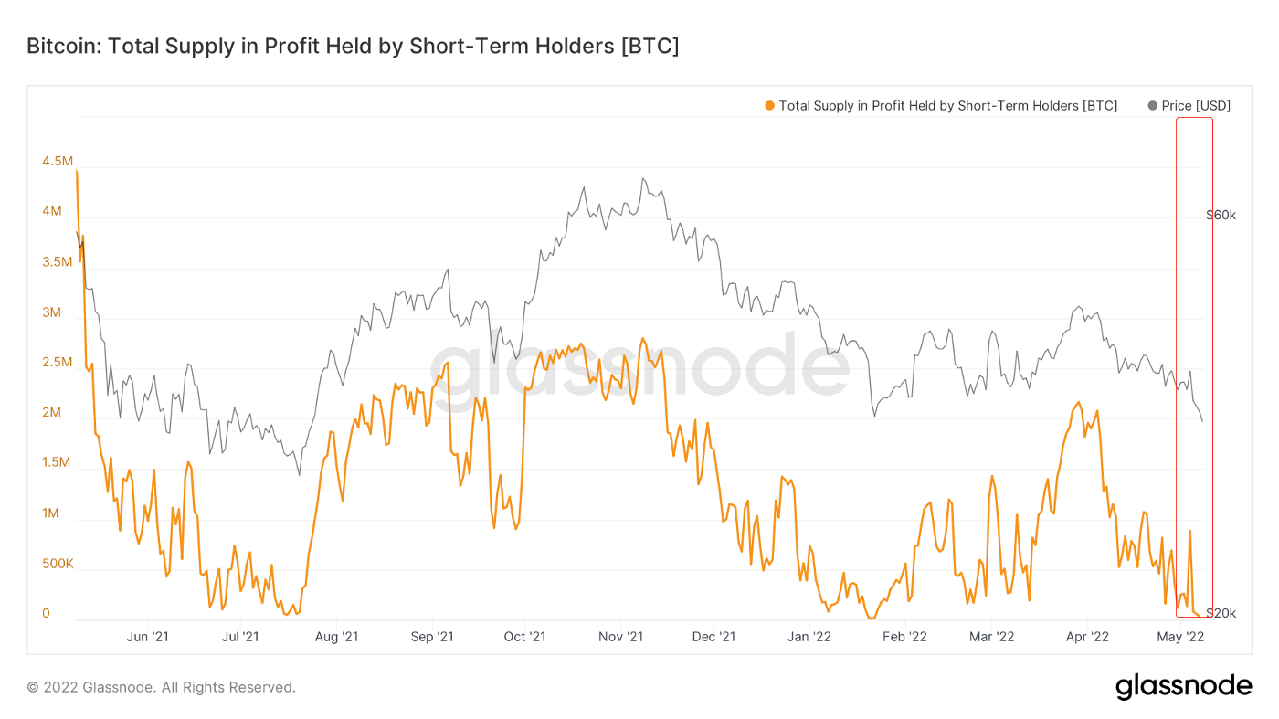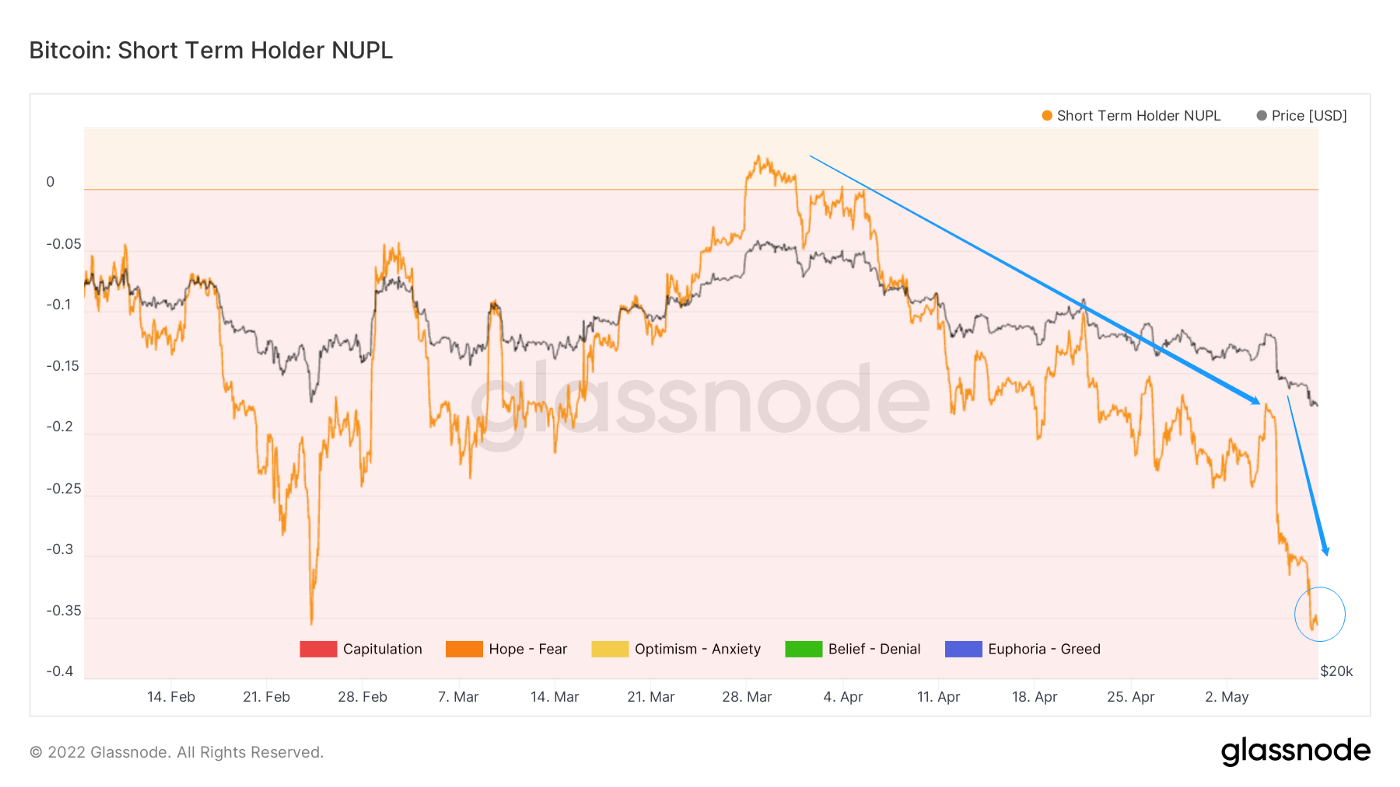 近期短期交易者的信心受到剧烈打击,情绪降到了低点,目前短期交易者未实现亏损的总额占总市值约35%左右,这也代表着市场上依然有较大部分的短期交易者的手中筹码依然是亏损状态。