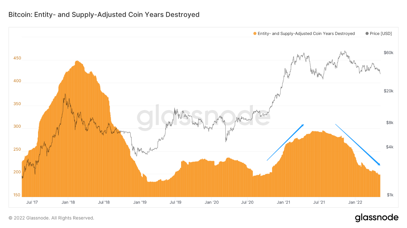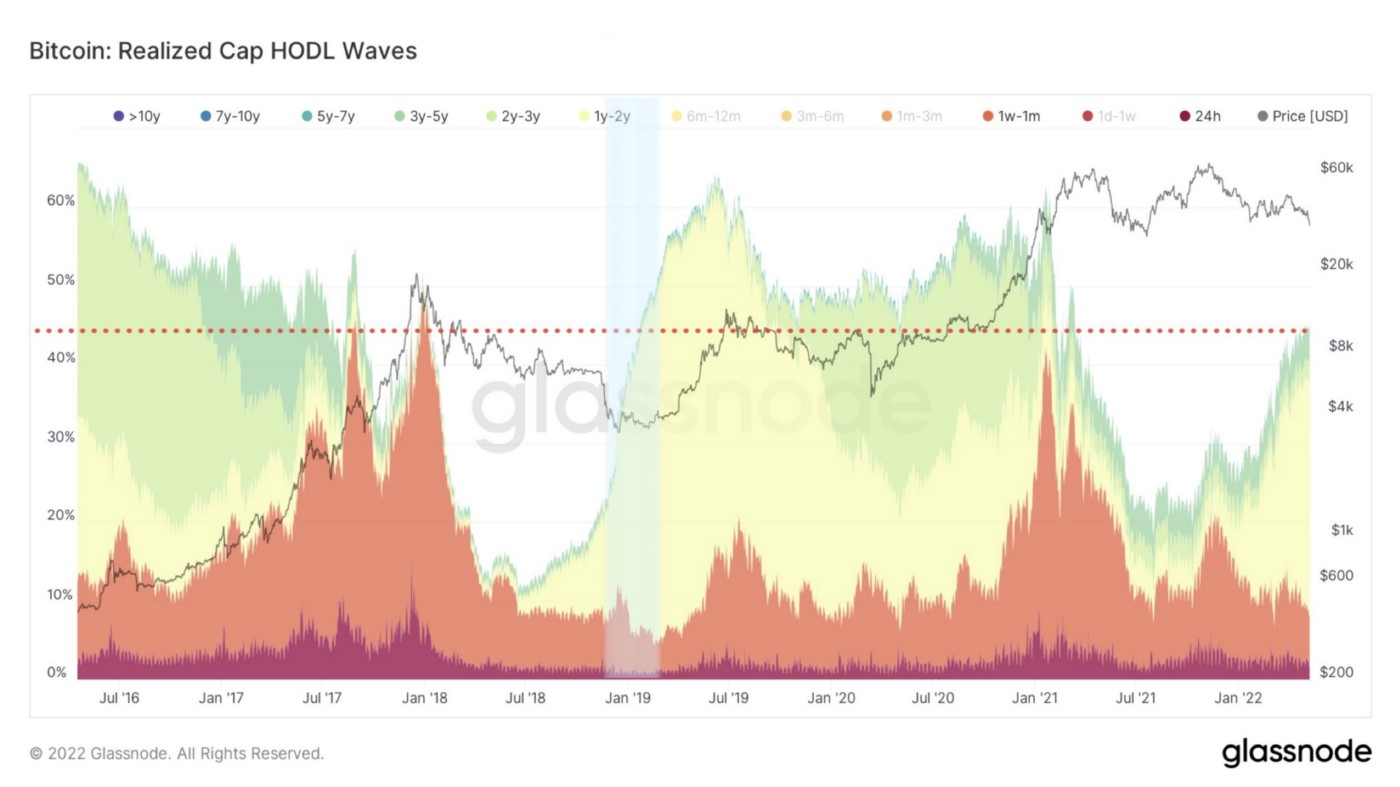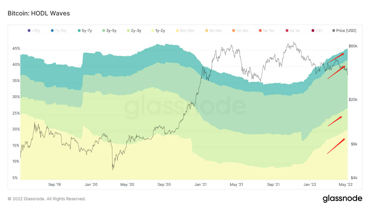 1年以上的地址用户持有的水平已经达到2019年1月下旬的水平。