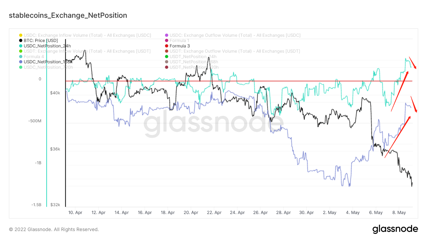 综合USDC净头寸变化,24小时净头寸USDC有略微流入的迹象但有所回落,168小时净头寸变化流出状态也在持续减小,但仍未呈现流入状态。