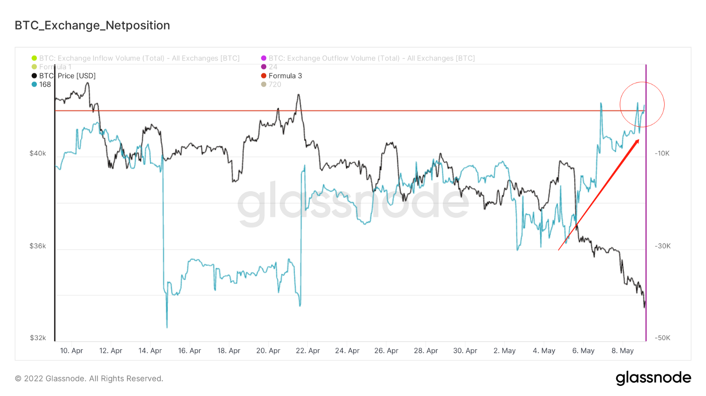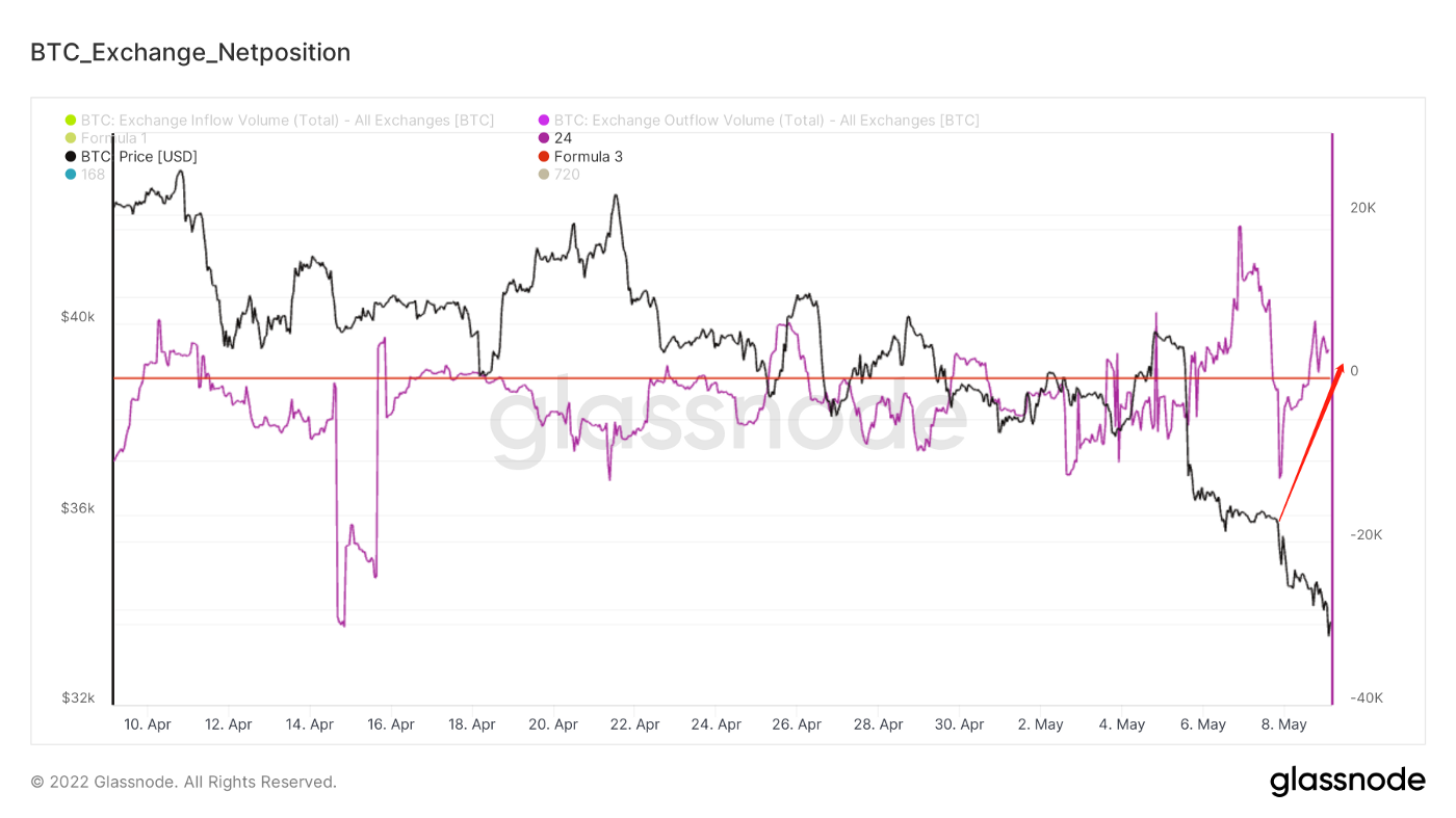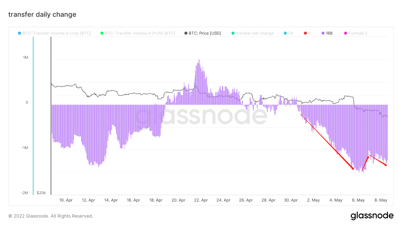 但168小时净头寸变化,净流出逐步减小,这意味着“潜在”抛售压力有上升的可能,目前已经有转为流出的迹象,注意市场潜在的抛售压力。