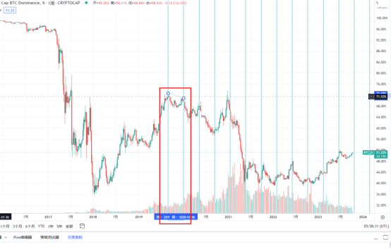 再有一个特点,2019年也出现过一次比特币统治指数接近开启熊市以后的高点,随后半年时间,就开启了牛初,因此这是否预示着庄家进行二次吸筹的尾声呢?