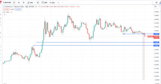 ETH/BTC的汇率目前0.057,接近熊市以来低点0.049,没有守住前多次测试的0.06,那么现在继续向下去的空间还是很大的,毕竟中间没有有力支撑。如果在本周内,没有强力反弹突破0.06,那么接下来看向下去到0.045-0.049,那么做空以太和山寨,就是绝佳机会。