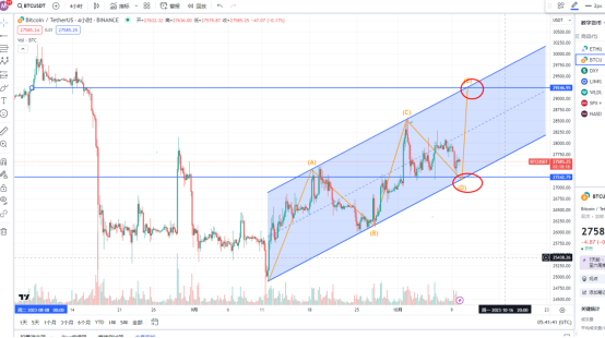 究竟哪种走势,我们需要密切关注2.72万,以及上升通道是否守住,如果没有守住,可以顺次做空,如果守住,我们可以小仓位尝试短多,赚此次B浪反弹的最后一波,如果没有发生再次测试两个关键支撑交叉点,依然选择2.82万美金附近高空。