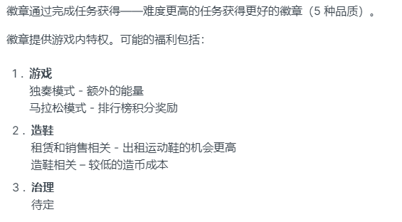 徽章系统原本以为是类似wow中的成就系统(就是单纯的满足玩家成就感,几乎无实质奖励)。但是目前来看,徽章更类似于一个玩家忠诚度奖励系统。玩的越久,投入越多,在stepn中就会获得额外的奖励。有点类似于defi中的boost,但是又不完全一样。