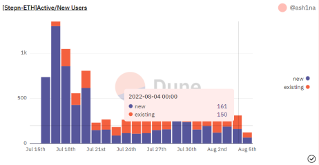 从上图可以看出8月3号开始出金金额暴增,入金金额萎缩。从这一天ETH链的经济正向循环被打破。但是大多用户只有在鞋价和币价大跌之后才会“后知后觉”,所以用户数量一直都是“滞后指标”。从下图可以看到用户数量在4号依旧没有很大变化(由于是6号晨间的数据截图,当时5号链上用户数据的统计还未完成,实际5号用户数量变化不大)。