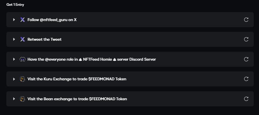 Visit and trade on Kuru Exchange, Bean Exchange, and Atlantis DEX: Complete at least one trade on each testnet DEX using the $FEEDMONAD token to qualify for the raffle.