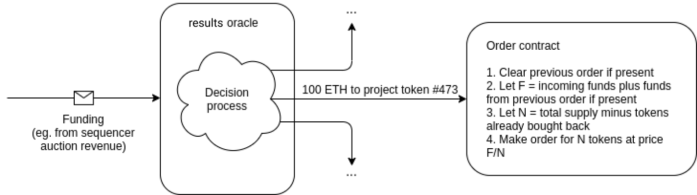 Los tokens de proyecto son una idea más radical, esencialmente creando un mercado de predicción para lo que financiará el oráculo de resultados. El oráculo de resultados podría usar sus fondos para establecer un precio mínimo para el token: si asigna una recompensa de $X y el proyecto tiene un suministro total de N tokens, entonces publica una orden abierta para comprar hasta el suministro total de esos tokens a un precio de $X/N por token.