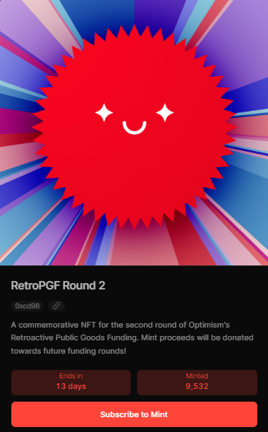 Pronto compartiremos más sobre nuestros aprendizajes, y reflexiones de RetroPGF 2. Mientras tanto, puede acuñar este Mirror Subscriber NFT para conmemorar este hito histórico para Optimism, Ethereum, y la comunidad de código abierto en general. Todos los ingresos de la acuñación de este NFT se van a agregar a la financiación de RetroPGF 3.