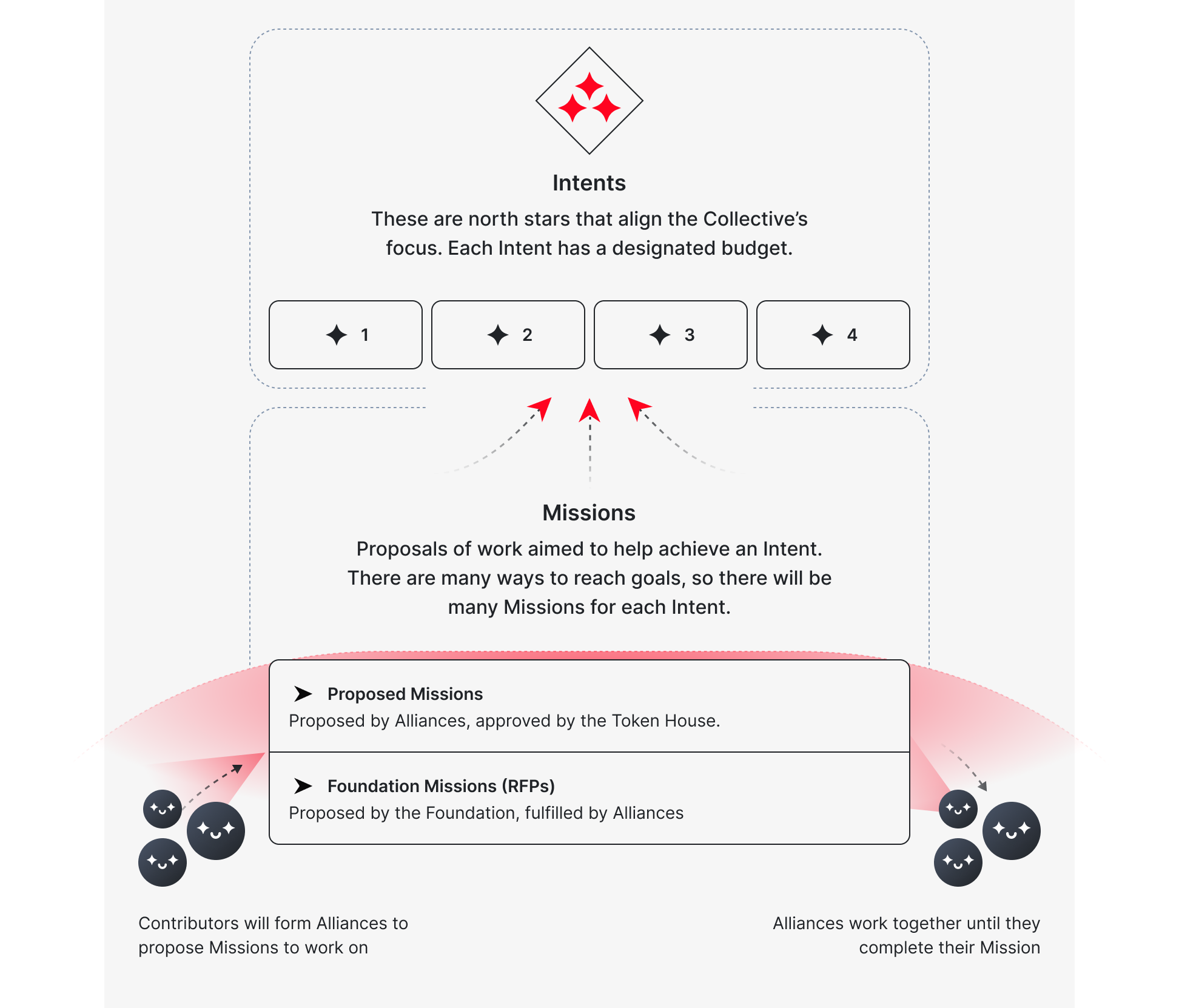 Las Misiones Propuestas deben presentarse bajo una Intención. Cada Intención estará dotada de su propio presupuesto. Luego, la Token House ordenará las Misiones Propuestas hasta que el presupuesto para cada Intención se asigne por completo. Las Misiones Propuestas permiten que el Fondo de Gobernanza respalde una gama más amplia de iniciativas alineadas con nuestras Intenciones.