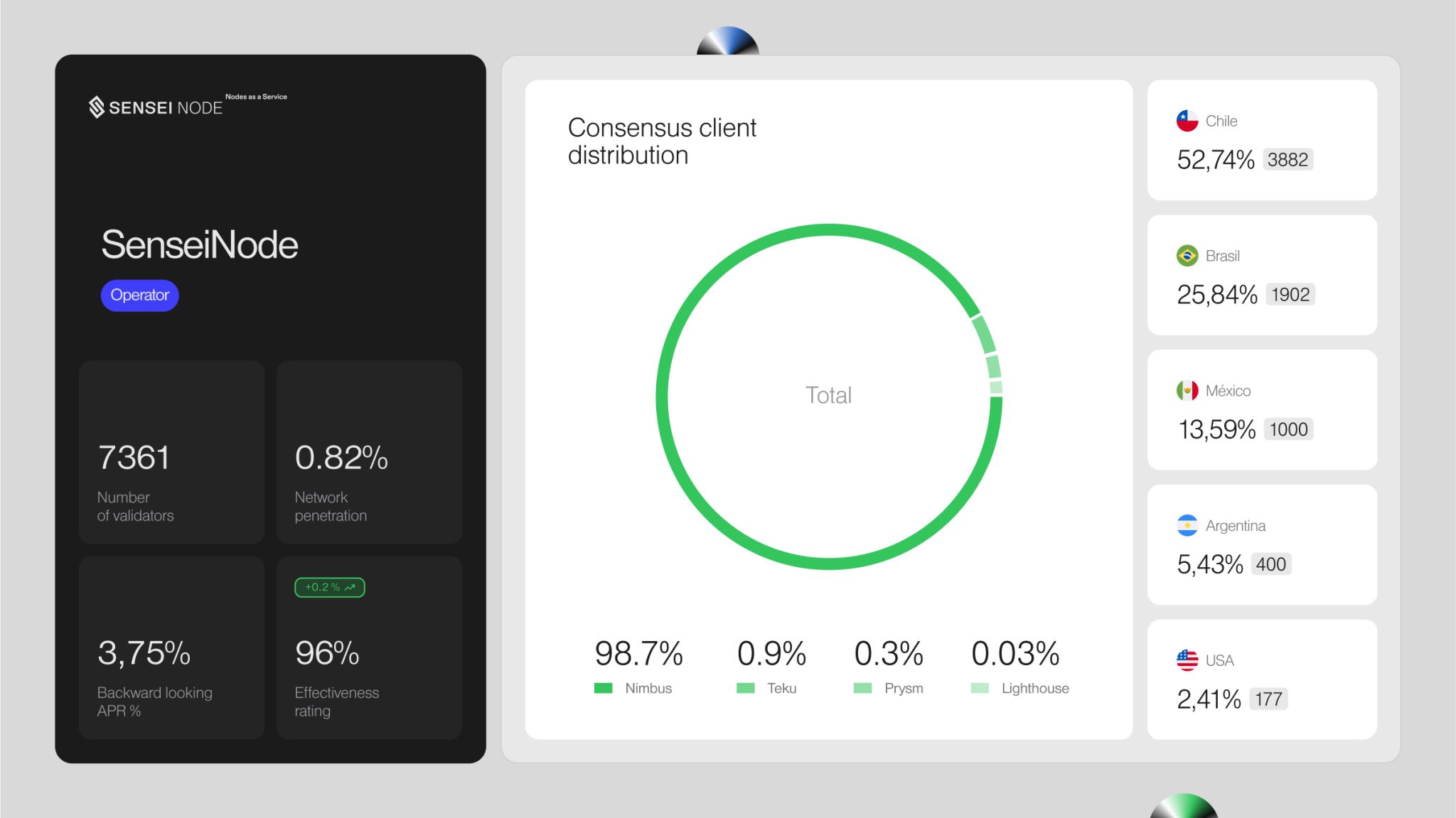 Desde SenseiNode reconocimos la oportunidad de mejorar la diversidad y seguridad de Ethereum. Al observar la alta concentración de nodos en ciertas áreas geográficas como Estados Unidos y Europa, y la dominancia de ciertos clientes, como GETH, que llegó a representar más del 80% de los clientes en la red, vimos una necesidad crítica de diversificar.