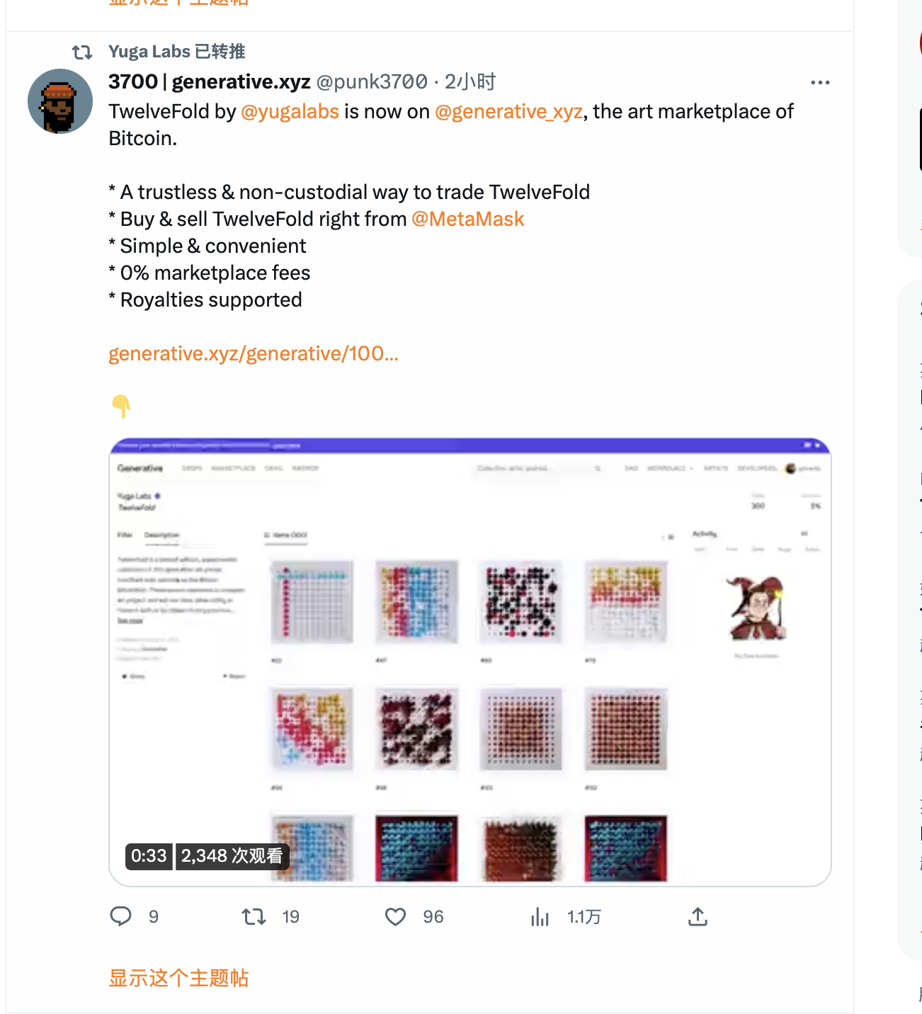 yugalabs转发了generative.xyz 的推特,内容是generative上线twelvefold系列。