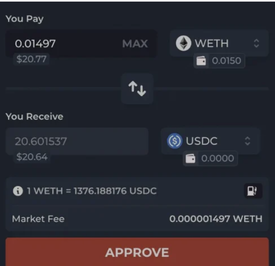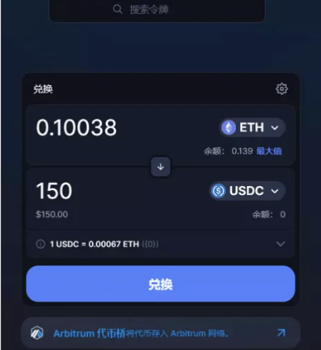 在uniswap(arbitrum链 app.uniswap.org/#/swap)上将ETH 换成 150USDC