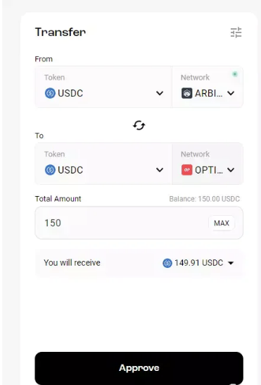 使用Stargate(stargate.finance/transfer)将150U跨链到Optimsim链