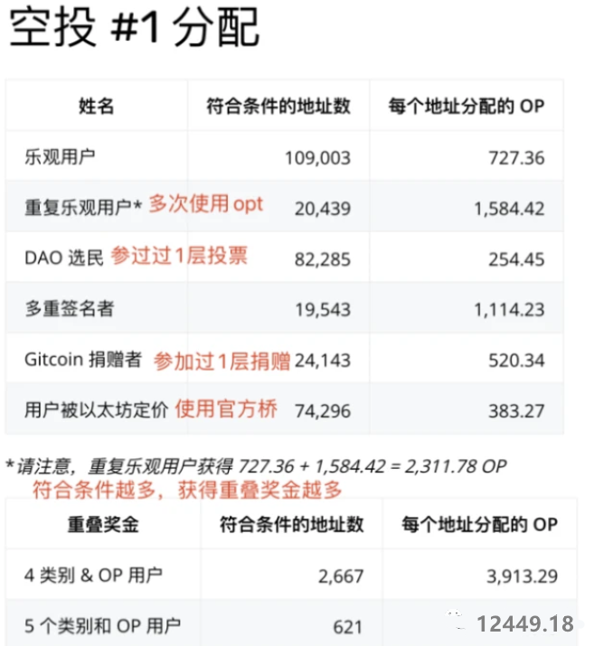 Optimism宣布了其治理代币OP的分配计划,19%用于用户空投,其中5%会在初始时一次性分发。空投对象不仅包括Optimism的历史用户,还对DAO投票者、多签用户、Gitcoin捐赠者和跨链桥使用者进行了奖励。有资格领取OP空投的地址超过25万个,为Optimism带来强大的社区基础。