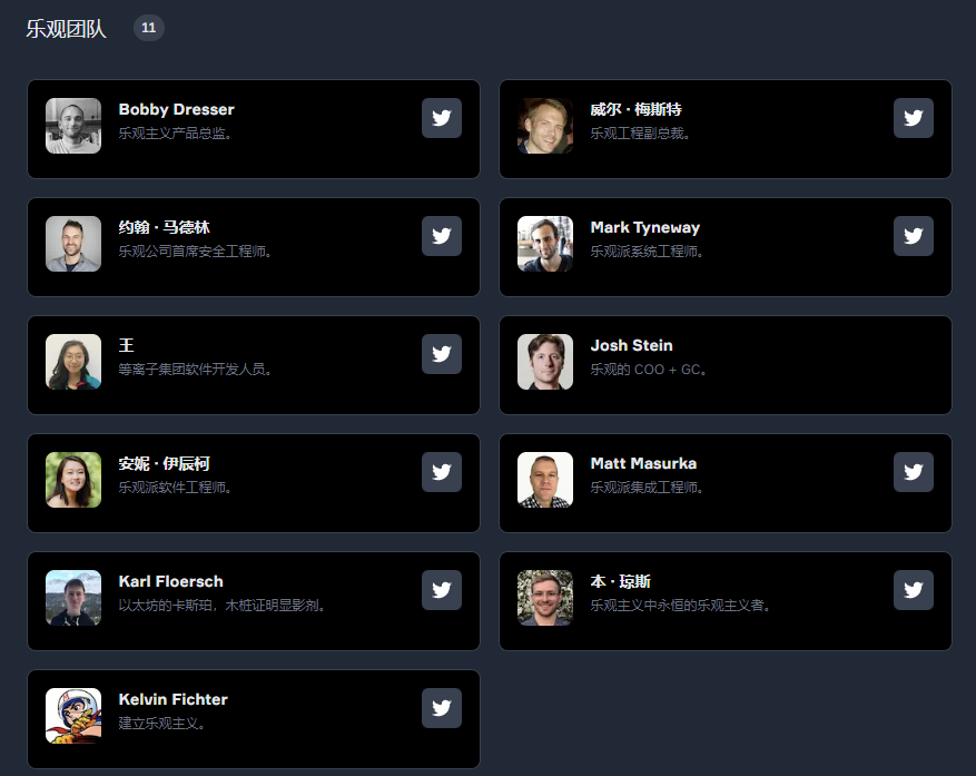 在 2017 年,Vitalik Buterin 和 Joseph Poon 合著了一篇论文,提出了以太坊早期的扩容解决方案 Plasma。随后,一群以太坊核心研究者接手了这个方案的研发,并且成立了一个非营利性研究小组来构建这个愿景。在 2019 年,由于 Plasma 的一些关键设计上的限制变得越来越明显,其开发进程停滞了。Plasma 的三位主要研究者 Karl Floersch、 Jinglan Wang 和 Ben Jones 决定转向研究 Plasma 的演变方案 Optimism Rollup,他们于 2020 年初成立了 Opti- mism PBC 团队。目前领英上显示团队人数有 35 人,核心成员信息如下: