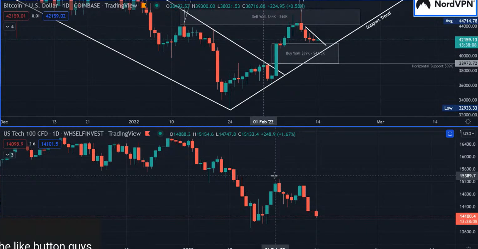 图表显示美股和比特币走势完全不同,44000到46000的区域是一个很大的强压力区域, 在40000-41000购买人数比较多。