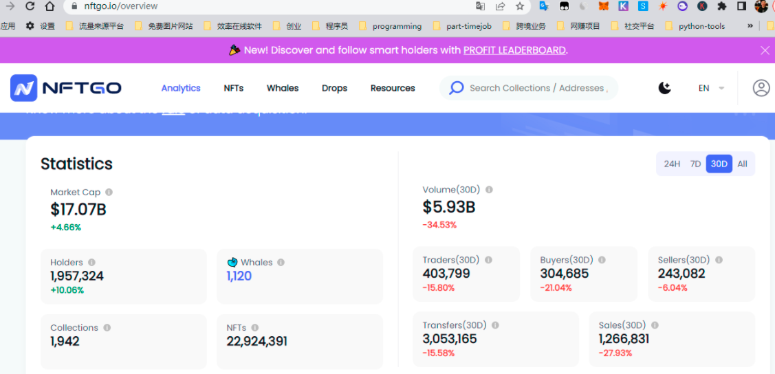其次,一切的交易策略,应当建立在大市行情的判断上,整体大盘就看整体交易量以及蓝筹NFT的交易量,如果他们的交易量都出现显著下滑,就要注意整体市场遇冷。在NFTgo这个工具里面,可以看到NFT市场的整体市值情况: