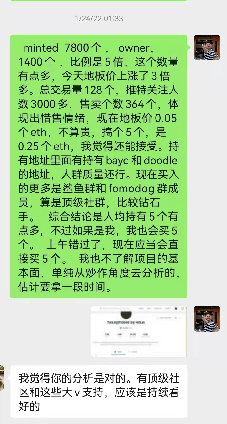 这个是1月24号,对hausphases这个NFT项目做出的一些技术层面的分析,因为当时价格便宜,团队搞了5个NFT,均价大约是0.09个eth,现在来看,在0.6个eth,卖出了3个,现在手上还持有2个,现在地板价约为0.9个eth。这一个项目,获利还可以。