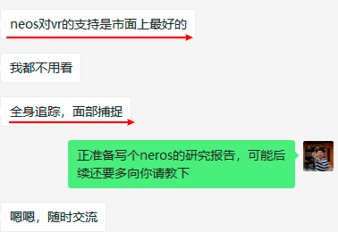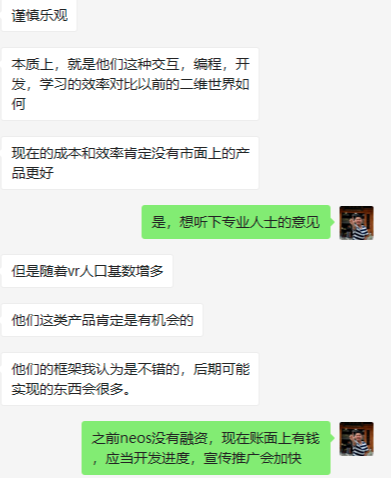 根据作者与VR测评玩家的交流,知道的信息是Neos框架不错,团队比较理想化,没有搞币圈项目的通常的营销宣传。