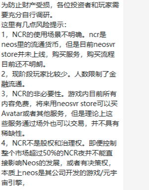 以下是玩家对于Neos的风险提示: