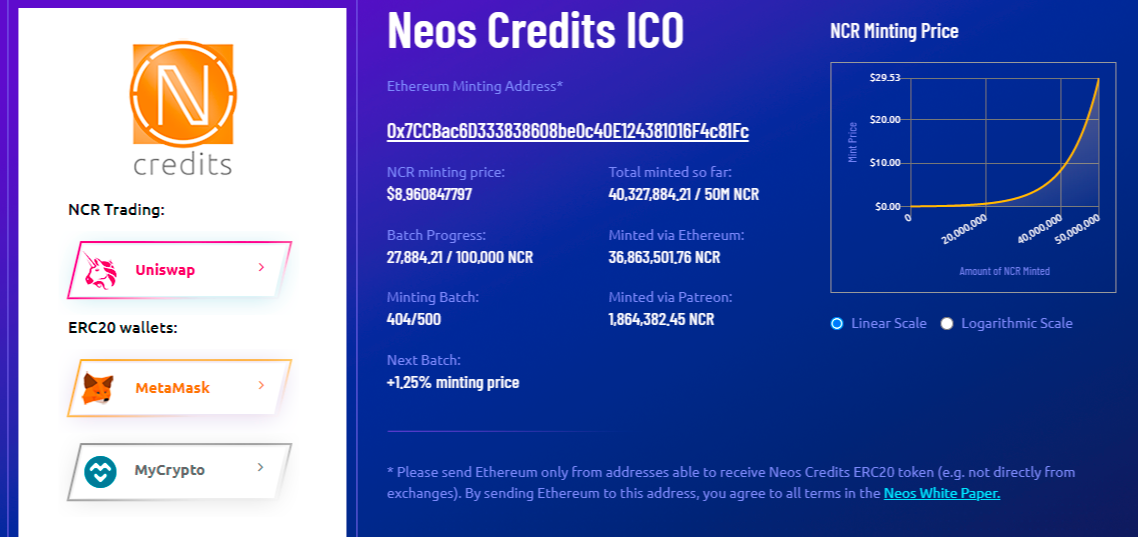 NCR代币的总量是5000万个,其中200万个归属于团队,无私募,通过赞助以及ETH来完成NRC的ICO,截止12月1号,通过ETH铸造的NCR数量为36,863,501.76个,通过赞助铸造的NCR为1,864,382.45个,总共铸造数量为40,327,884.21个。每个批次铸造完,铸造价格上涨1.25%,最终铸造完,其理论价格是29.53美元,按照现在进度,尚需4到5万个左右的ETH铸造完。