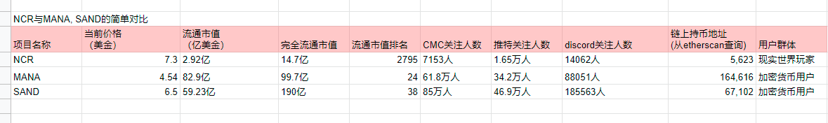 竞品主要选择两个,分别是decentralan(MANA)和sandbox(SAND),MANA和SAND的收入主要是靠卖地为主,而现在NCR是免费的,由用户自己去创建世界,只是存储空间需要用户用NCR购买。