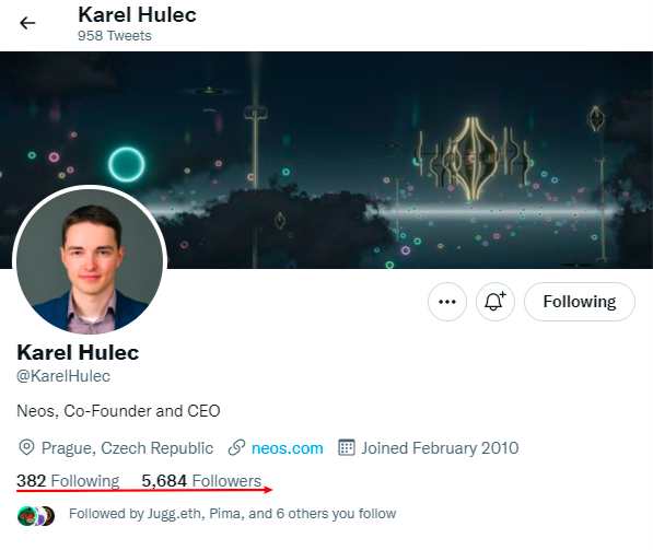 Karel Hulec, 推特@KarelHulec, 加入过加密货币早期的社区,从事过加密货币挖矿业务,后与Frooxius共同创建了Neos, 是Neos的CEO.