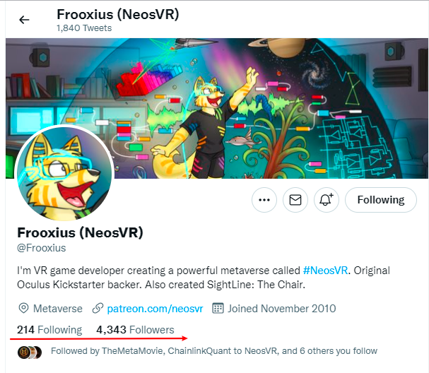 Frooxius的推特为@Frooxius,注册时间为2010年11月,关注人数4341人,点赞在20到200之间。观察其推特发现,Neos早期用户以日本人和英语玩家为主。