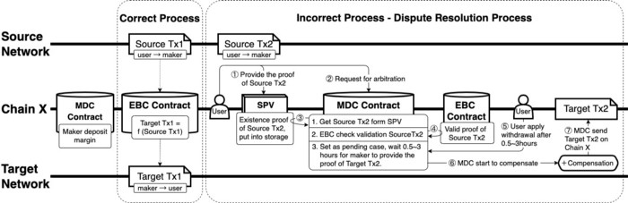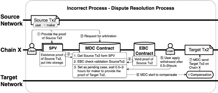 然后,MDC 会将本次仲裁设置为待处理,等待 Maker 提供 Target Tx 0.5~3 小时(此功能可在 Maker 客户端聚合,Maker 不会错过)。如果 Maker 可以提供正确的 Target Tx,MDC 将从 EBC 获得有效性证明,并知道 Target Tx 与 Source Tx 匹配。MDC 将关闭此仲裁并将 Target Tx 显示给 Sender。但是,如果 Maker 在 0.5~3 小时后无法提供相关的 Target Tx,Sender 可以申请提现,然后进行下一步。