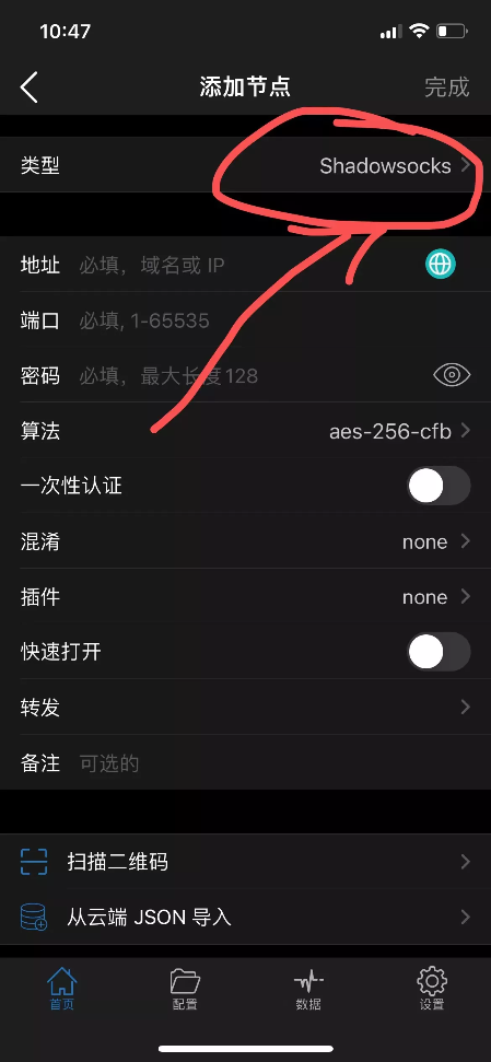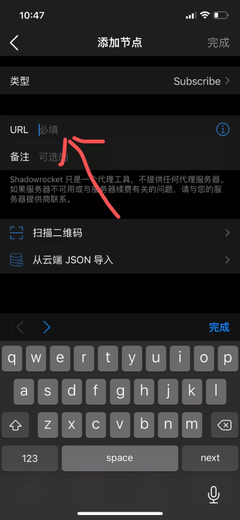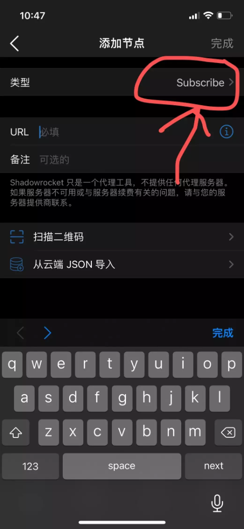 打开软件后点击右上角➕,把类型shadowsocks切换成subschibe,在URL里面粘贴节点网址,点击确定,节点信息便自动更新完毕。之后会跳出iphone授权是否授权vpn,点击确定即可。