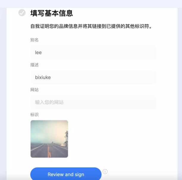 4、在这里填写您的基础信息,网站链接可以不填写,图片链接地址可以随便在百度上找一张图把链接填进去,然后点击Review and Sign。