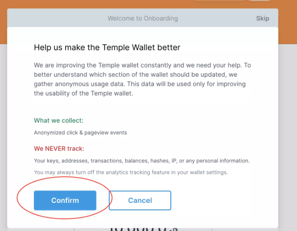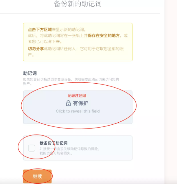 6、这一步是提示你不要将你的注记词分享给其他人,不要点击来路不明的网址之类的风险提示,直接点击Confim。