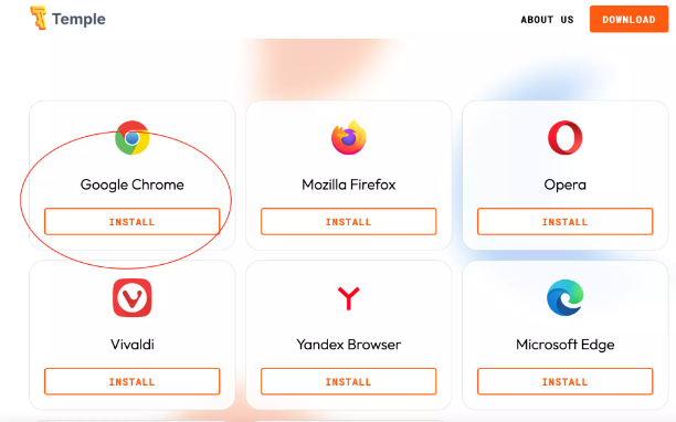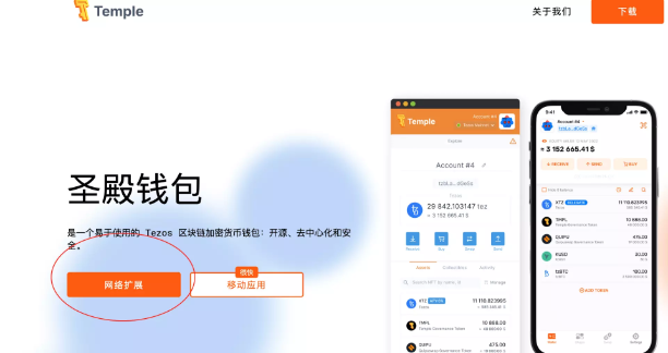 1、首先打开网址 https://templewallet.com/,点击网络扩展,选择谷歌浏览器,将扩展文件添加到Chrome。