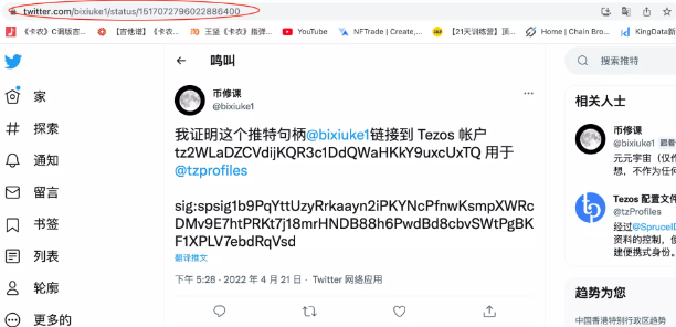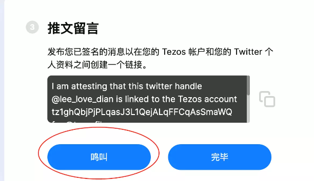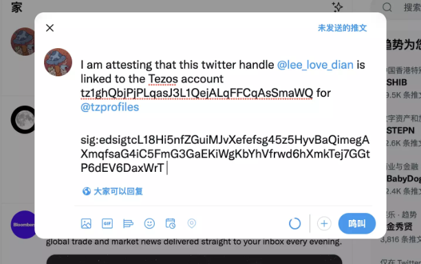8、转发推特链接,点击鸣叫,自动弹到推特,点击发送。之后回到之前的推文留言叶面,点击把发送的推特链接,复制粘贴到签名验证。