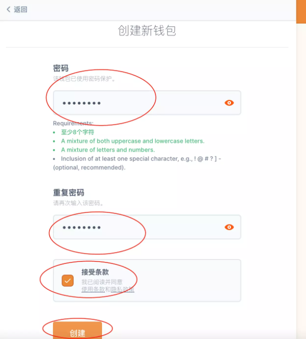 3、输入您的钱包密码(最少八位数的数字字母组合,需要有大小写),勾选接受条款之后点击创建