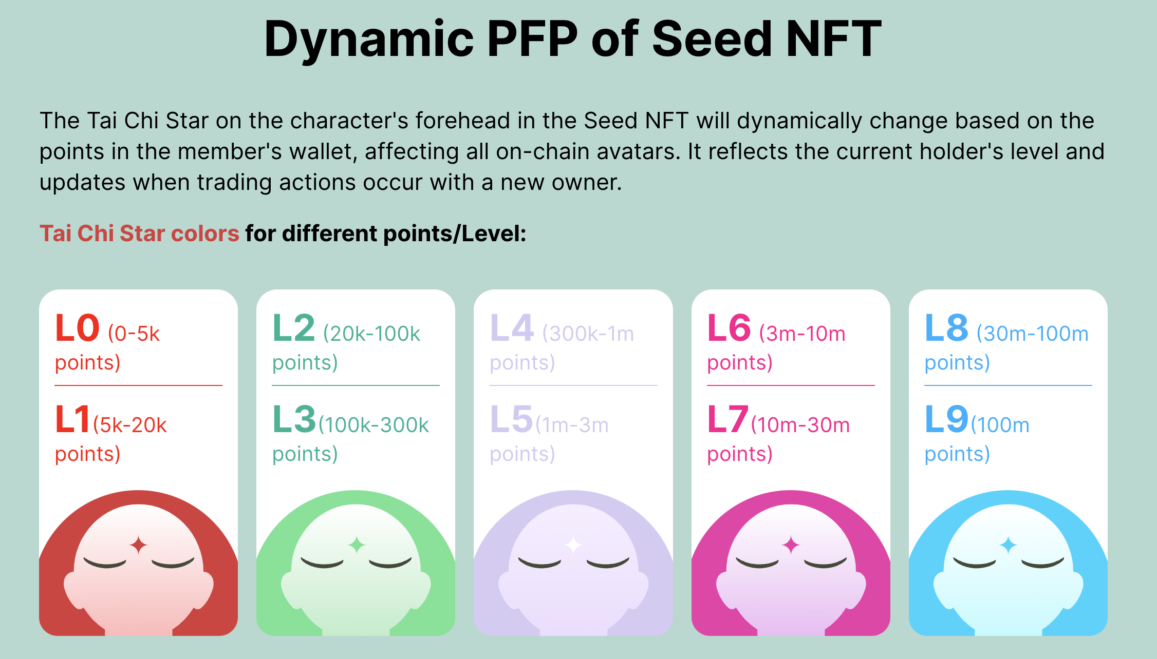 Time, as they say, waits for no one. As SeeDAO grew, there was a desire to better reflect its evolving identity and expanding community. The Seed NFT was envisioned not as a replacement but as an evolution—a new chapter in the same grand saga. Designed to be more than just a digital token, the Seed NFT came adorned with a dynamic Tai Chi Star. This star wasn't a static design; it dynamically reflected the holder's wallet points and influenced on-chain avatars. This was SeeDAO ensuring that every member's unique journey was mirrored and celebrated.