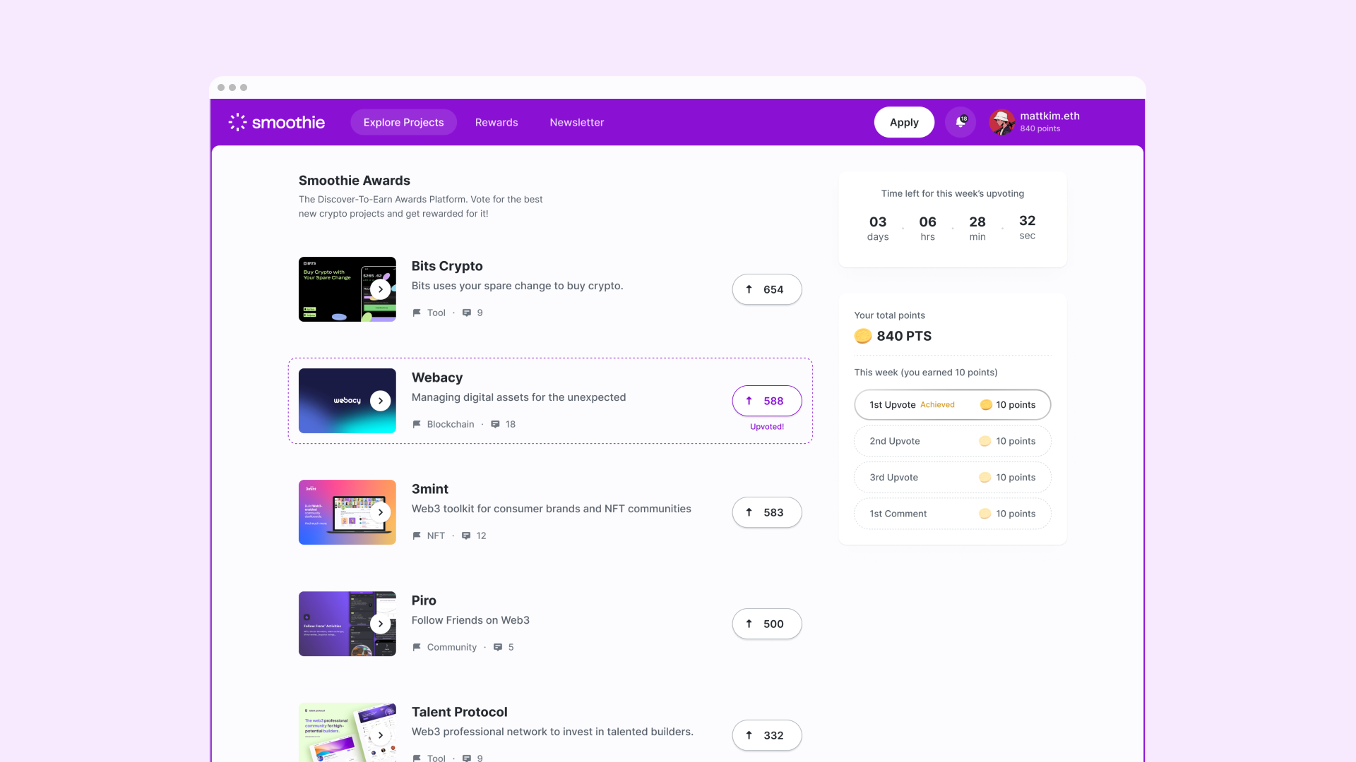Smoothie is a discover-to-earn awards platform for web3 projects Smoothie helps founders launch new web3 projects and get the distribution they need.