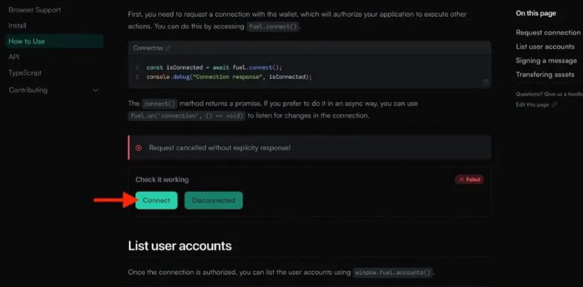 转到wallet.fuel.network/docs/how-to-use,找到“Request Connection”,并连接。