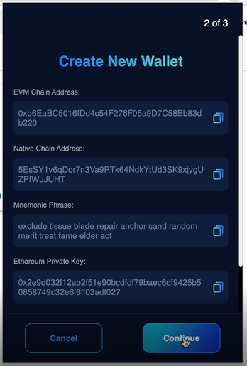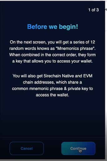 您还将收到 5ireChain Native 和 EVM 链地址,它们共享用于访问钱包的通用助记词和私钥。如果您无法访问您的帐户,则需要此短语来恢复您的钱包。