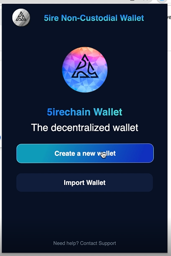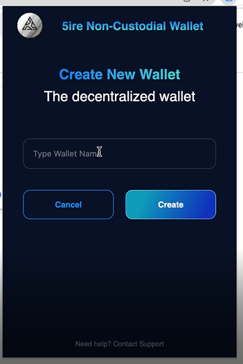 步骤2:单击创建新钱包按钮开始使用 5ire 钱包扩展创建您的 5ire 钱包。为您的钱包命名,然后单击“创建”。