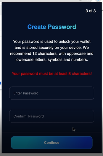 然后,系统会要求您为下一步选择一个密码。密码需要至少八个字符长。建议选择唯一且不用于任何其他目的的密码。通过包含符号、数字以及大小写字母的组合,使其尽可能安全。
