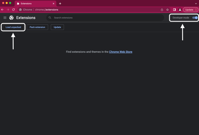 点击Load unpacked并从刚刚解压缩的 .zip 文件中选择 chrome 文件夹。