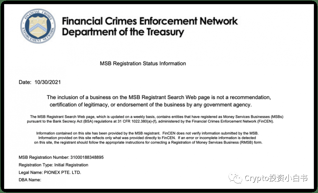 Pionex 成立于新加坡,因此它通过了新加坡金融管理局(MAS)的审核,被列入MAS 的名单中。图片 此外,派网还拥有FinCEN(金融犯罪执法局)的MSB 监管牌照,允许其经营加密货币相关业务。该牌照可以在FinCEN 官网中进行查询。