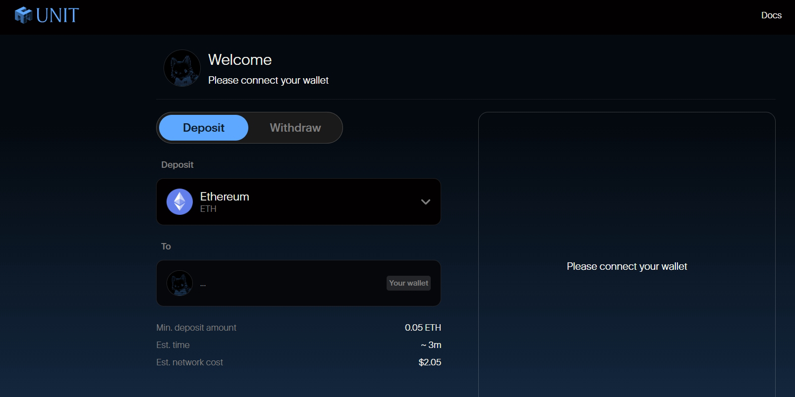 Open the Unit Dashboard and select your route (e.g., ETH → uETH on Hyperliquid).